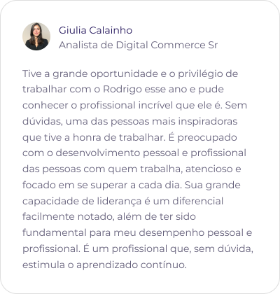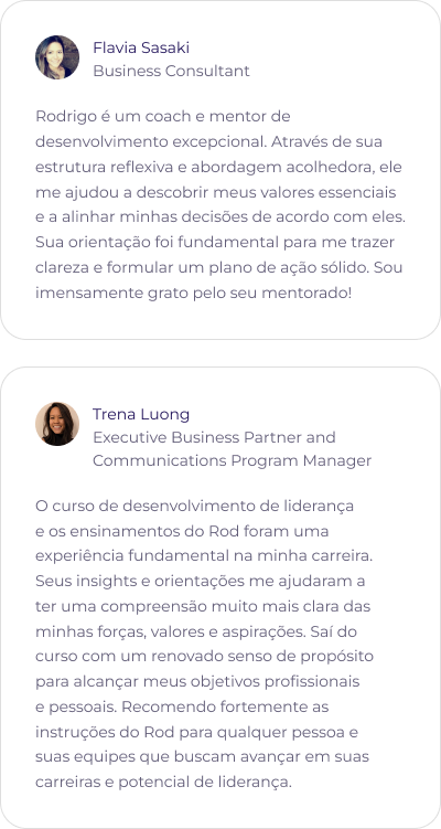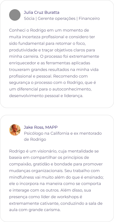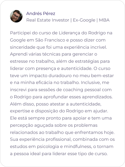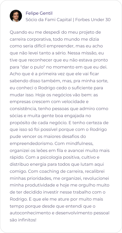 Com publicações científicas reconhecidas e colaborações em livros de Psicologia e Desenvolvimento Pessoal, Rodrigo é professor em programas de destaque como o MBA em Desenvolvimento Humano de Gestores da FGV, o MBA da PUC-RJ e a Pós-Graduação em Psicologia Positiva, Neurociências e Mindfulness da PUC-PR.