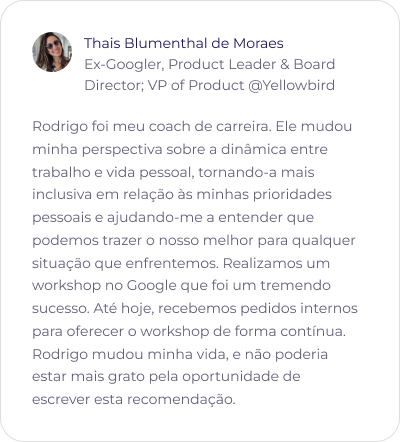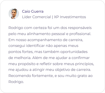 O programa é ideal para profissionais em qualquer estágio de carreira que buscam clareza, equilíbrio e mais realização na carreira. O programa ajuda a alinhar sua jornada profissional ao seu propósito e valores pessoais, além de guiá-lo na construção de um Plano de Desenvolvimento Individual que acelera seu crescimento e sua habilidade em criar e aproveitar oportunidades profissionais.